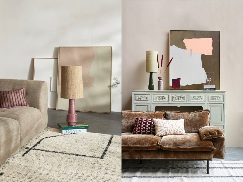 "Abstract" (musztardowy i nude) oraz "Abstract II" (odcienie olive/nude) – idealne do wnętrz w stylu modern, japandi czy mid-century modern. Ich spokojna, ciepła paleta barw wprowadza harmonię i elegancję.