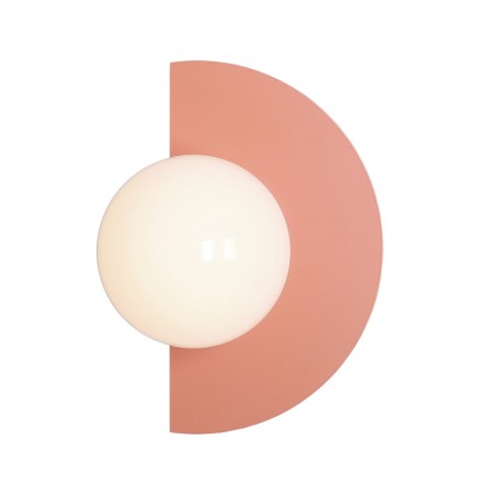 Półkolisty dysk w odcieniu koralowym tworzy harmonijne tło dla klosza z opalowego szkła, rozpraszającego światło w delikatny, nastrojowy sposób. Ten dekoracyjny kinkiet ścienny sprawdzi się idealnie w nowoczesnych aranżacjach, zwłaszcza w sypialni, korytarzu, czy salonie, gdzie liczy się zarówno funkcjonalność, jak i estetyka.