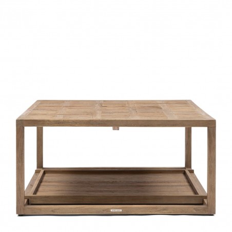 Stolik kawowy Fraser Island Riviera Maison to rustykalny mebel wykonany z odzyskanego dębu, z naturalnym usłojeniem drewna. Wyjmowana dolna półka może służyć jako taca do serwowania, a wymiary 45 × 90 × 90 cm sprawiają, że stolik idealnie pasuje do salonu lub kącika wypoczynkowego.