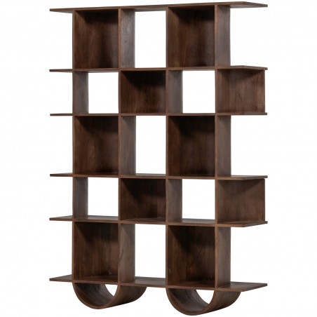 Regał Sinne marki Woood, to wyjątkowy mebel z litego drewna mango, osadzone na półokrągłej podstawie. Naturalne usłojenie, złocisty odcień i otwarte przegródki czynią go zarówno funkcjonalnym, jak i dekoracyjnym elementem wnetrza.