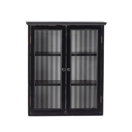 Elegancka wisząca szafka z czarnego drewna sosnowego, ze szklanymi drzwiczkami i ozdobnym tyłem w paski. Idealna do przechowywania i ekspozycji w stylu vintage.