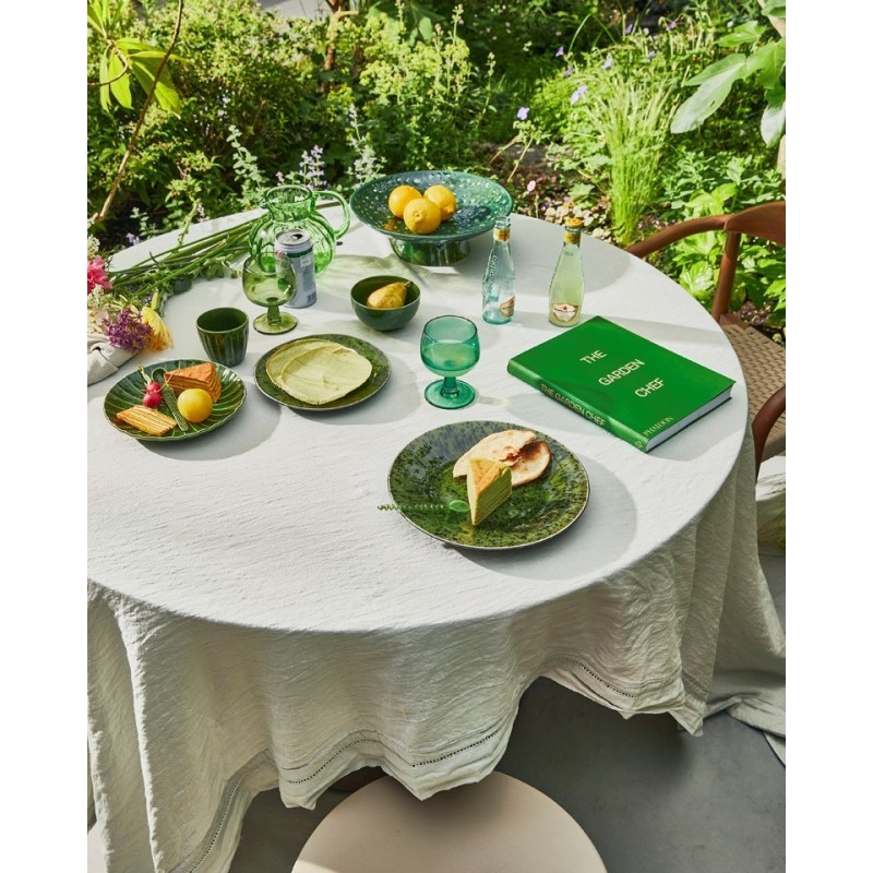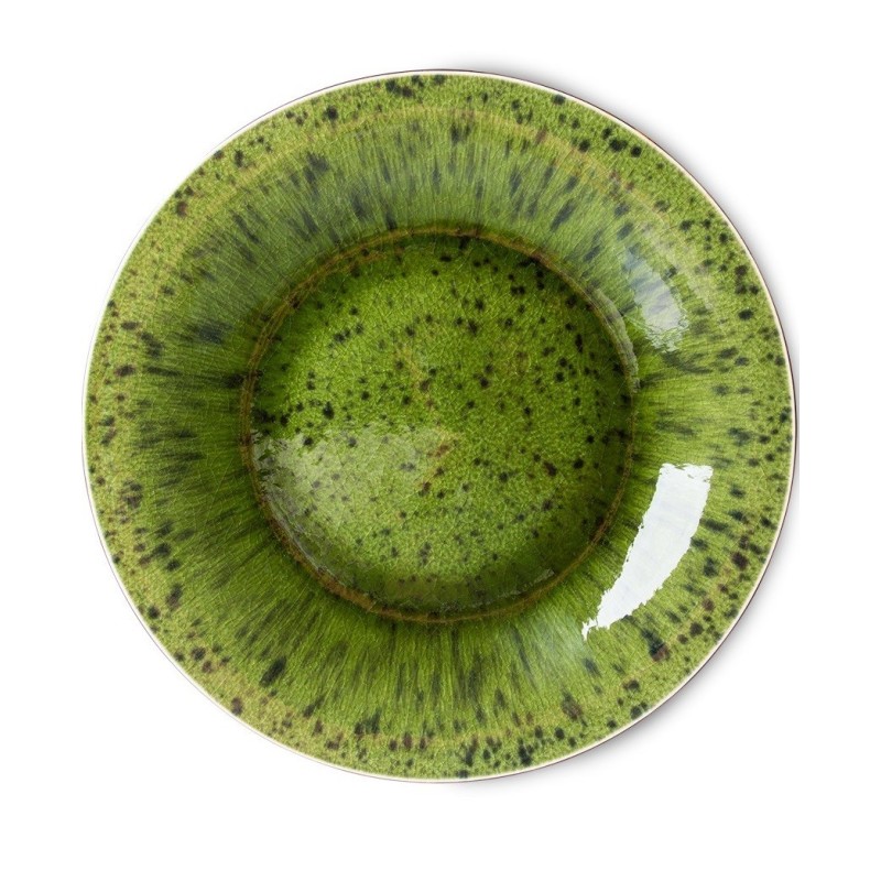 Talerz delikatnie cętkowany z wyraźnie ciemniejszym kolorze zieleni, ręcznie szkliwiony z widocznymi spękaniami tworzy małe dzieło sztuki.